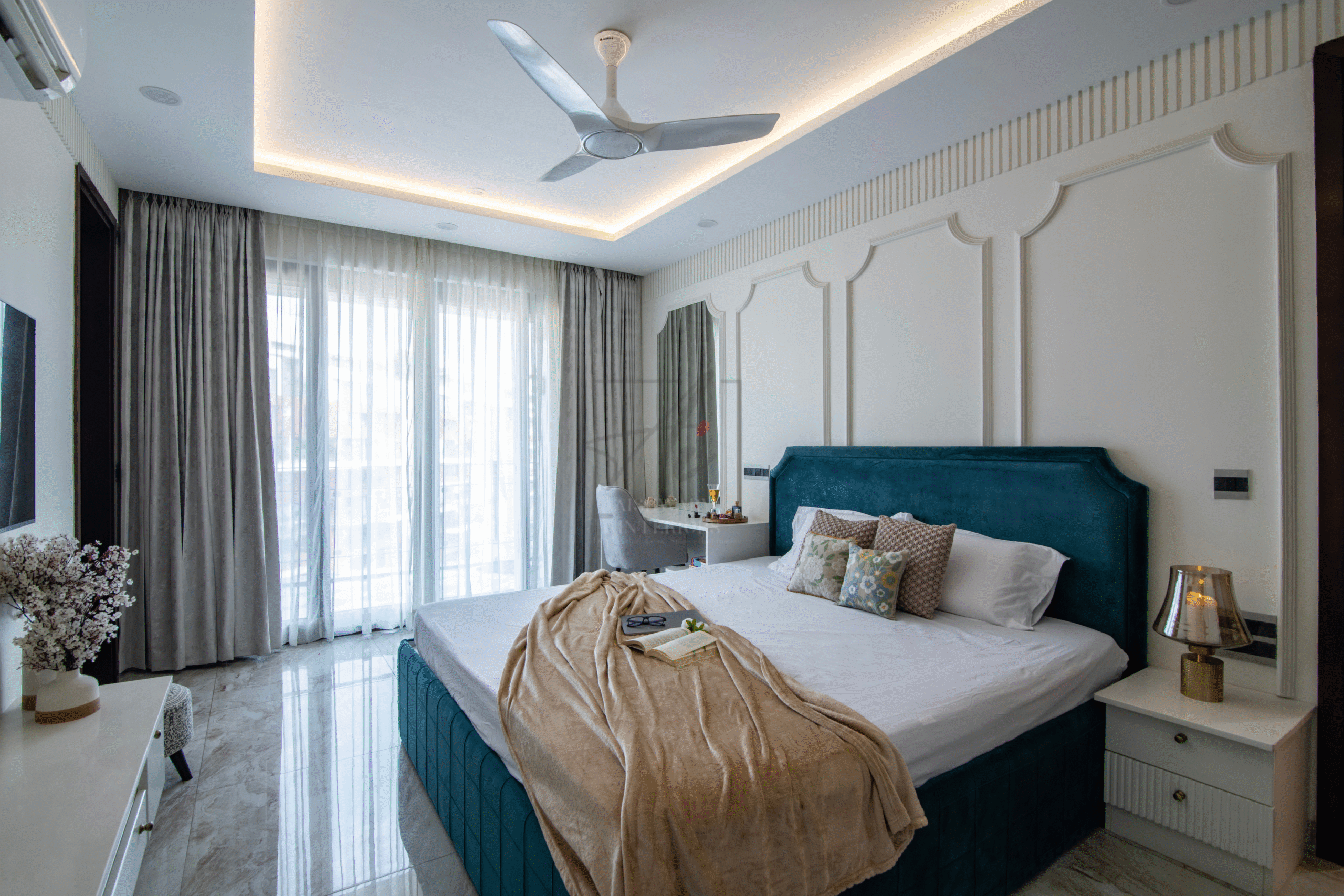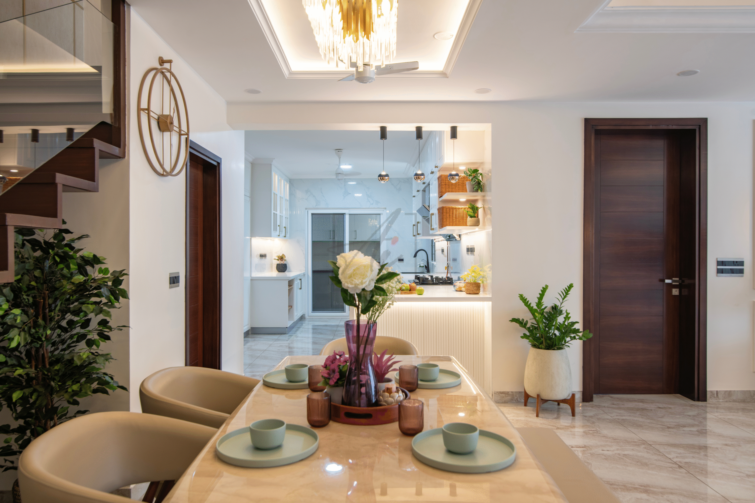 The double-height foyer shimmers with grandeur, while the serene, softly detailed bedrooms exude warmth and intimacy. This project is a perfect example of how luxury villa interiors in Bangalore can blend timeless European sophistication with the ease of contemporary living.
